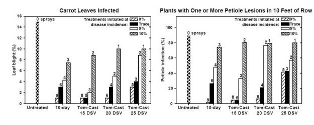 This indicates that the first treatment in carrots should be done as soon as we can find the first disease incidence in the field. From now on it worked fine by the use of the TomCast model with a threshold of 20 DSV accumulated since the last spray.