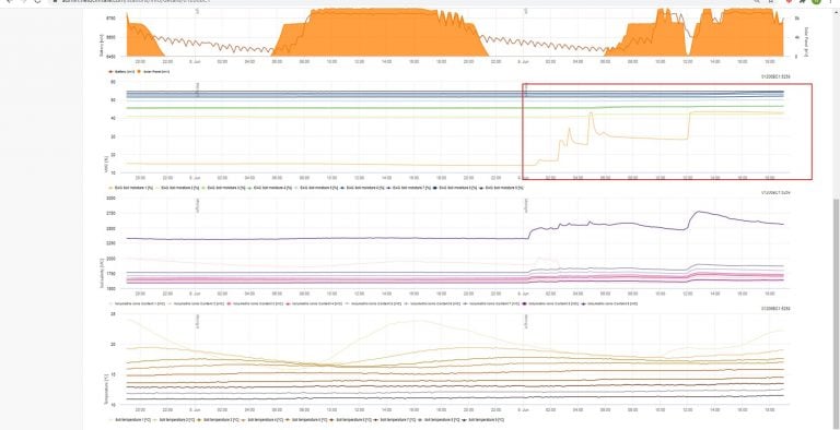 The first graph shows the rain event and the second shows the change in the soil. The response of the soil moisture probe was instantaneous.