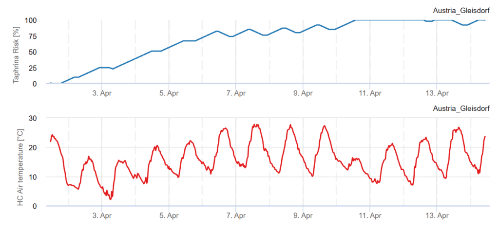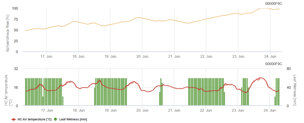 El modelo tiene en cuenta la temperatura del aire y la duración de la humedad de las hojas para calcular el riesgo. La temperatura óptima oscila entre 21 y 27'c y el desarrollo de la enfermedad se ralentiza a temperaturas superiores a 28'c. Dado que las esporas y el micelio son sensibles al calor extremo y a la luz solar directa, las temperaturas cálidas moderadas y la sombra suelen ser favorables. No se requiere humedad para que el hongo se establezca y crezca tras la infección. Se forman muchas más conidias en condiciones secas que en húmedas. Un valor superior a 60% indica un alto riesgo de infección, por lo que deben considerarse medidas fitosanitarias.