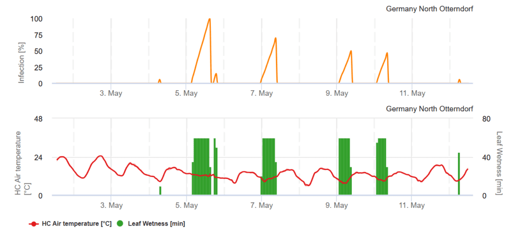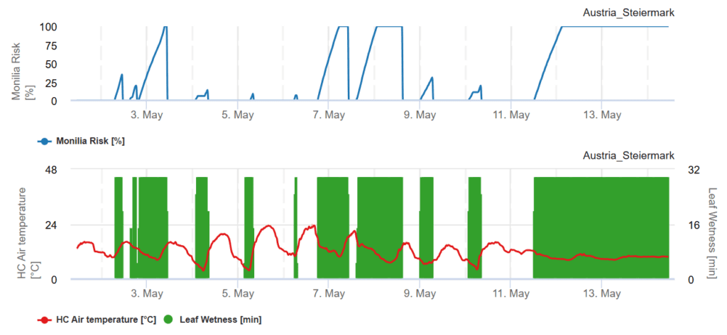 La curva a 100% indica condiciones óptimas para un Monilia infección en los huertos. Los cálculos se basan en la humedad de las hojas, la temperatura y la humedad relativa. Monilia spp. está bien adaptado a temperaturas relativamente bajas durante la primavera y causa infecciones a temperaturas tan bajas como 5°C dentro de un periodo muy corto de duración de la humedad. La infección 100% en el gráfico indica las condiciones óptimas para que el hongo penetre en el tejido vegetal y cause infecciones. Hay que tener en cuenta las medidas fitosanitarias curativas.
