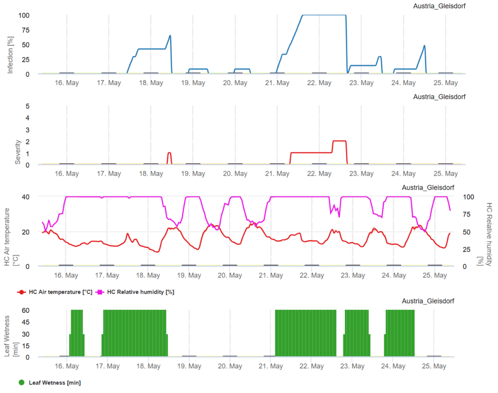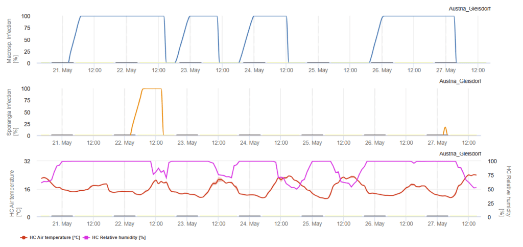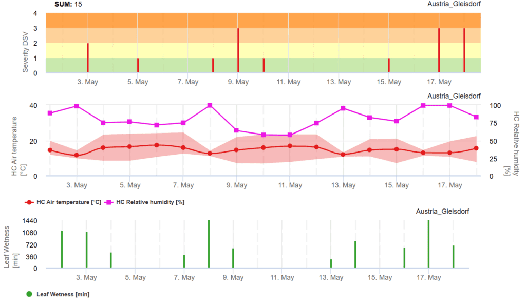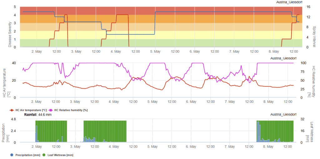 Ha az összes felhalmozott DSV meghaladja az ajánlott permetezési küszöbértéket, a betegség kockázatának csökkentése érdekében javasolt a gombaölő szerek alkalmazása. A grafikon az egyes DSV-ket és azok kumulatív összegét is megjeleníti. Az ajánlott permetezési időköz általában 15 és 20 DSV közé esik. Amint az összes felhalmozott DSV meghaladja ezt a küszöbértéket, a növény védelme érdekében gombaölő szeres permetezés szükséges.
