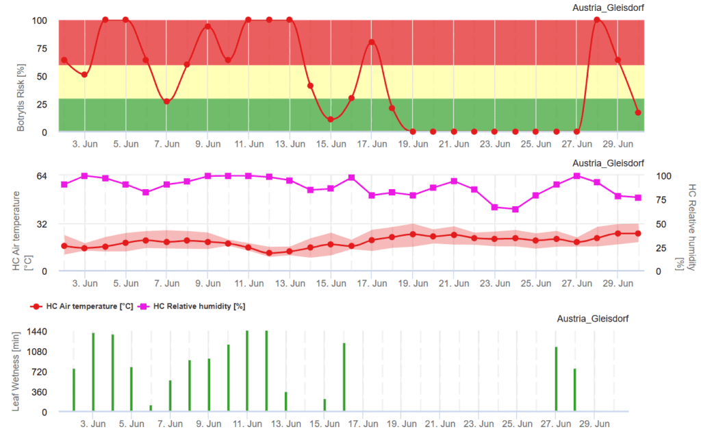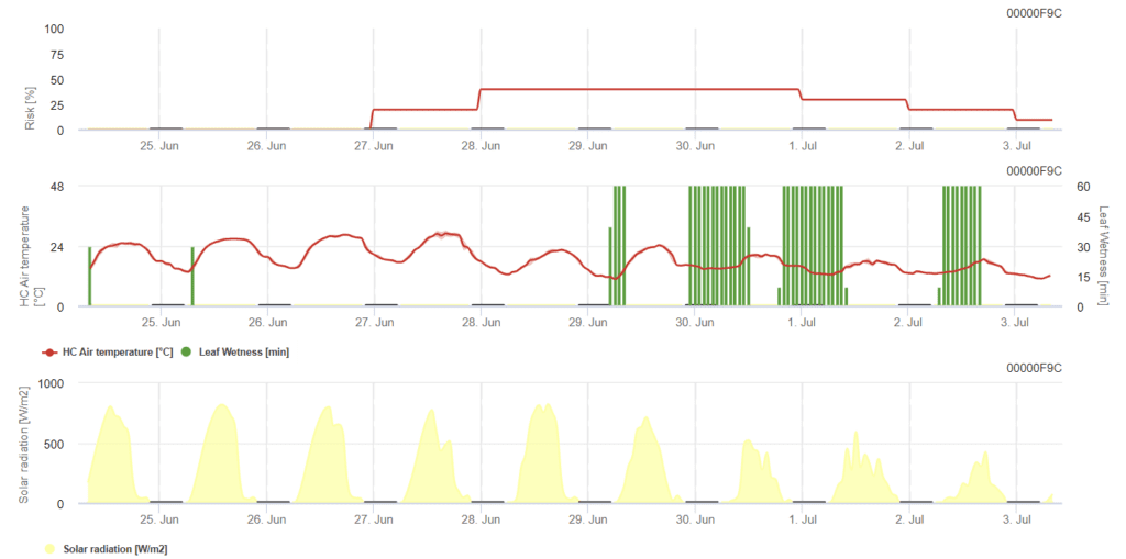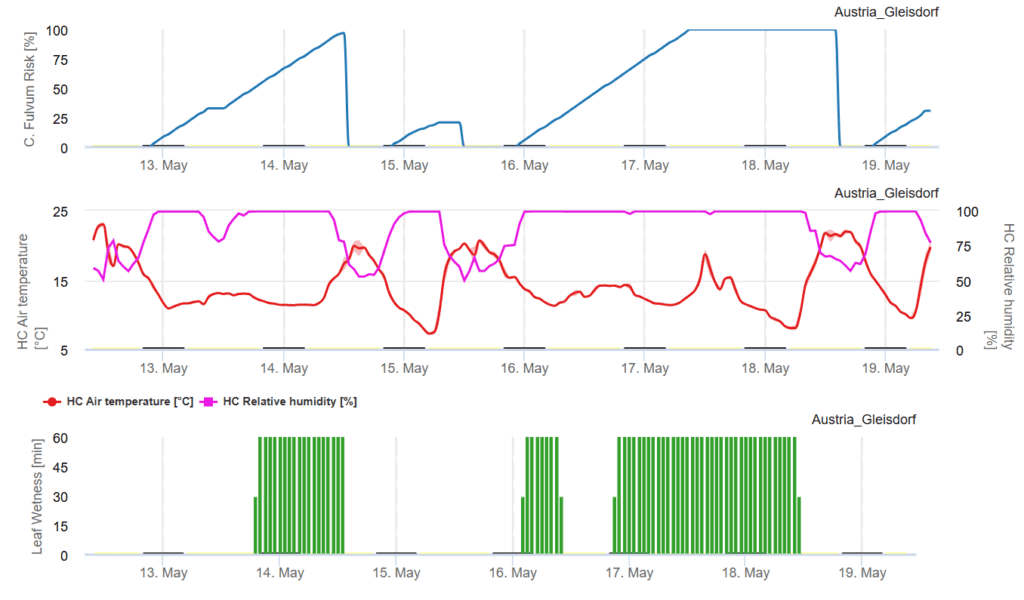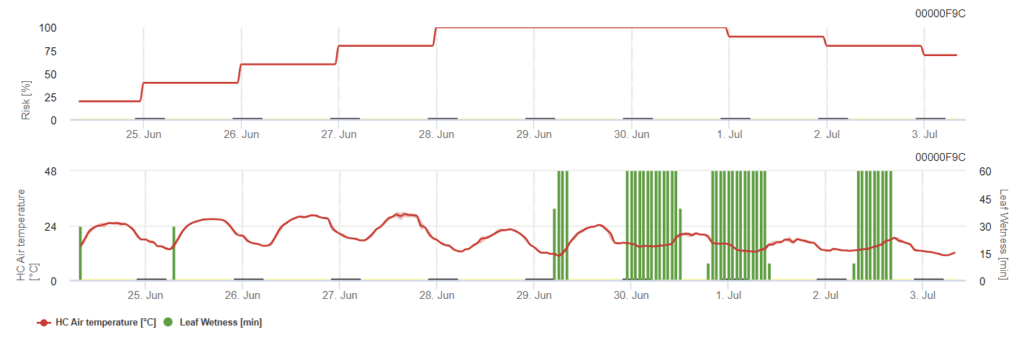 Értékeljük a kockázatot Cladosporium fulvum fertőzés a levélnedvesség, a relatív páratartalom és a levegő hőmérsékletének megfigyelésével. A grafikon kiemeli a magas fertőzési kockázatú időszakokat, amikor a görbe 80% és 100% közé esik.