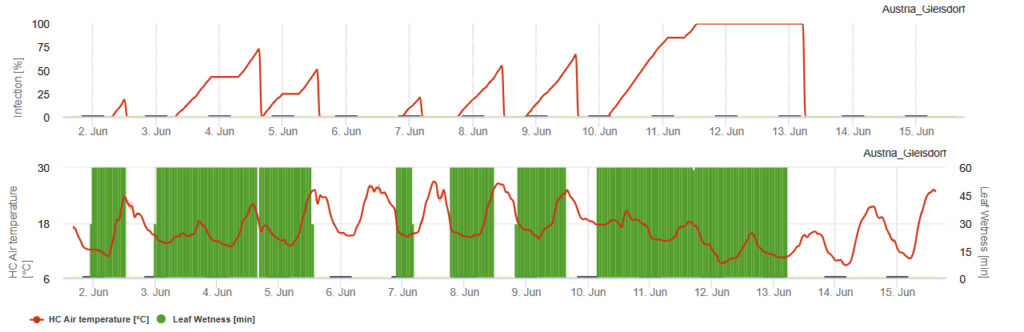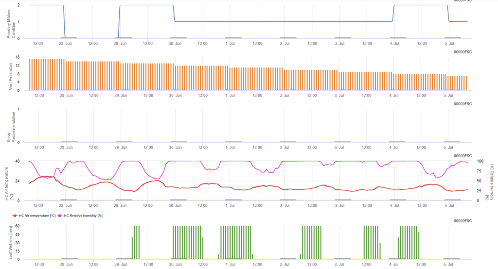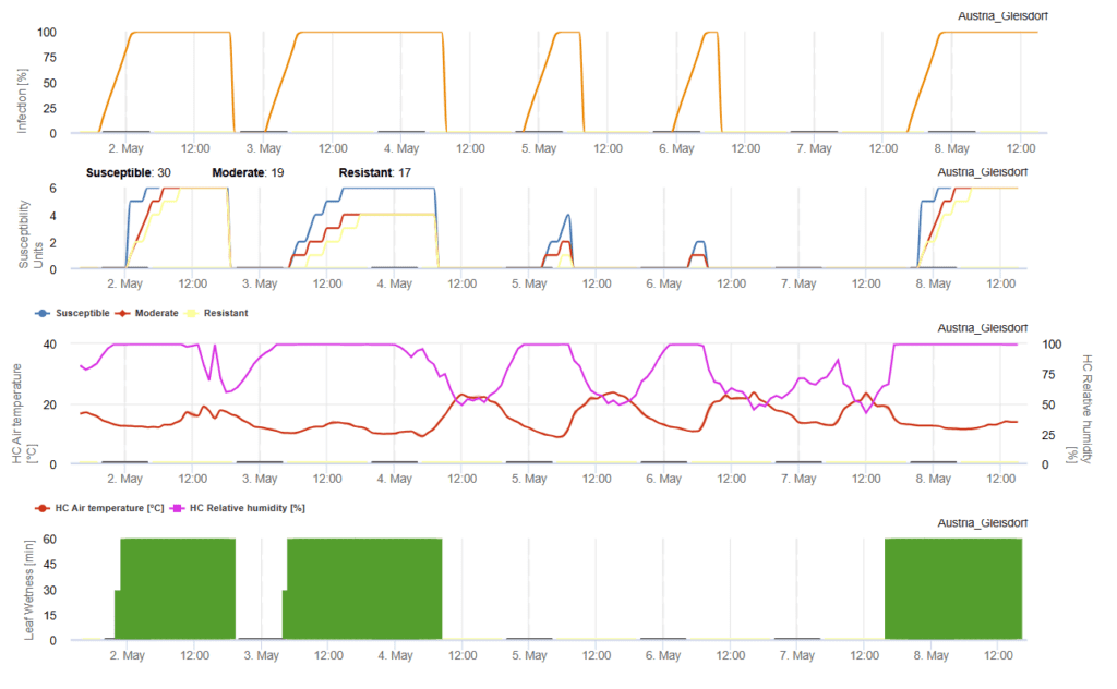 Ez a modell a a Kaliforniai Egyetem (Davis) által kifejlesztett előrejelzési modell.. A lisztharmat számára kedvező feltételeket a hőmérséklet, a relatív páratartalom és a levélnedvesség alapján határozzák meg, és ezeket az első grafikonon ábrázolják. Ez alapján történik a betegség következő értékelése és a permetezési ajánlás.