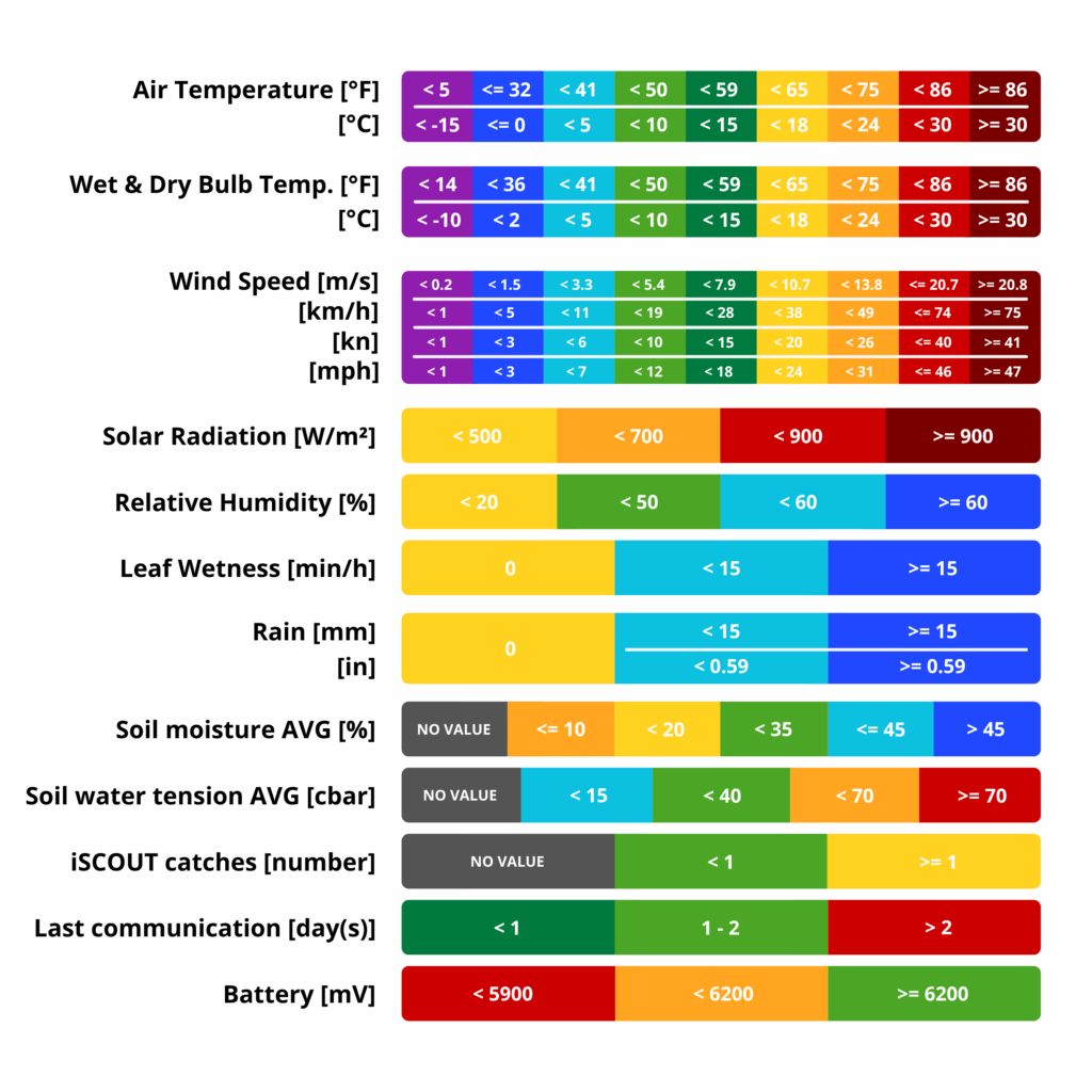 Odczyty warunków pogodowych na miejscu są wymagane przed każdym opryskiem, w szczególności zawsze zalecany jest odczyt na żywo Delta T. Ustaw minimalny lub maksymalny próg dla ostrzeżeń SMS. Odczyt na żywo Delta T jest aktualizowany co 5 minut.