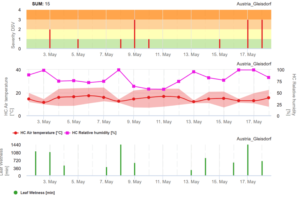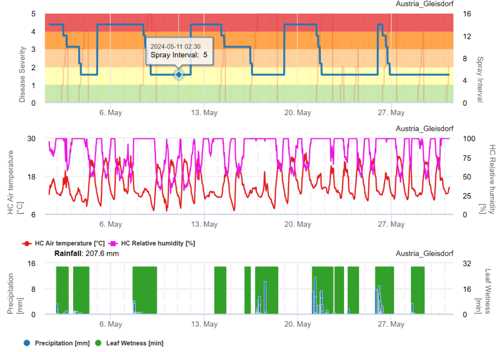 Возможность появления поздней вспышки болезни прогнозируется путем накопления так называемых "значений тяжести" из модели NoBlight. Эти значения основаны на погодных условиях (мягких и влажных) и накапливаются, когда они подходят для развития патогена. Мы показываем эти значения тяжести в сочетании с рекомендуемым интервалом опрыскивания (сокращенный интервал при высокой тяжести и увеличенный интервал при низкой тяжести).