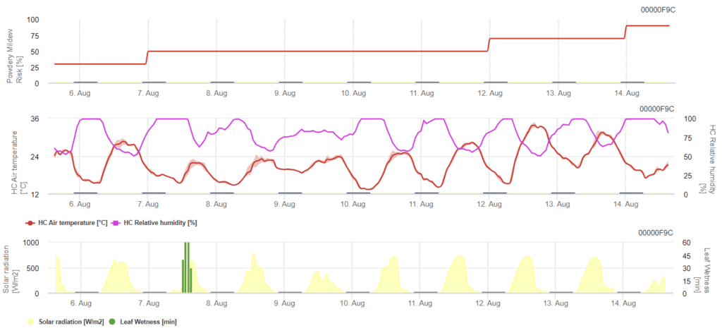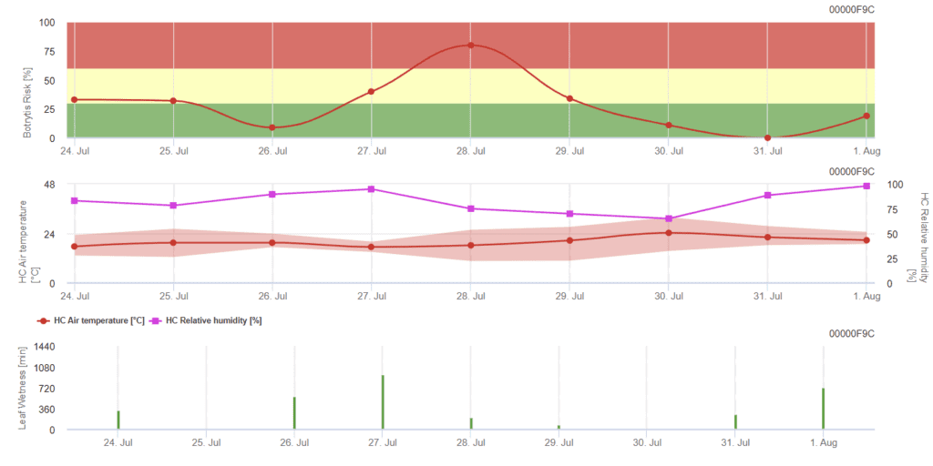 Модель рассчитывает риск появления серой плесени. Теплые периоды с длительным периодом увлажнения листьев повышают риск, а сухие периоды снижают его.